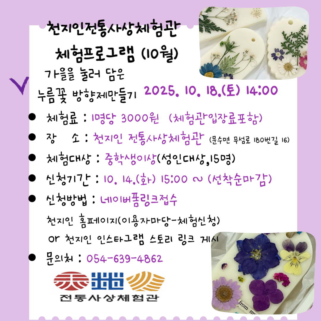영주시 천지인 전통사상체험관 누름꽃 방향제 만들기 (2025. 10. 18. 토 14:00)